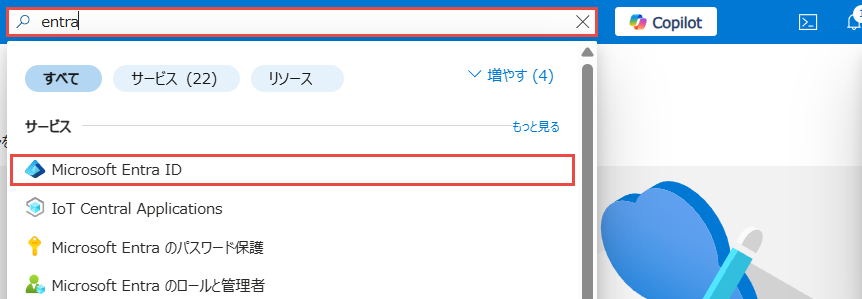 Microsoft Entra ID管理画面に移動します。(画面上部の検索ボックスにentraと入力し、表示されたMicrosoft Entra IDをクリックします。)